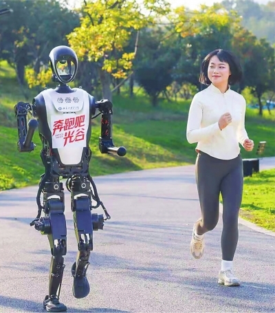 人形机器人沿着光谷中心生态廊道的步道奔跑。